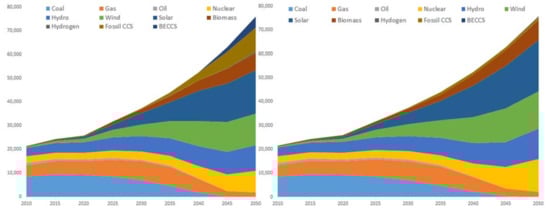 The decarbonisation of electricity systems is an important mitigation option, as confirmed by various studies [,]. Renewable-powered systems will be viable over the coming decades, but it will be challenging to supply the entire system only with weather-dependent renewable energy [], as economic, operational and regulatory challenges increase with higher shares of variable generation [,]. Recent studies indicate that large shares of solar PV and wind power can be integrated in power grids through increased storage capacities, grid expansions and greater demand response [], but in most model-based studies assessing mitigation pathways, the use of CCS technologies plays an important role in climate-constrained scenarios []. Decarbonisation of electricity production is mainly driven by the high uptake of renewable energy especially solar and wind [,] combined with the expansion of CCS technologies, fired with fossil fuels or biomass. Variable generation can produce almost the entire electricity amounts in specific local contexts [], but several operational and technical issues remain unresolved, while high amounts of investment in storage, grids, and flexible plants (with low utilisation rates that cannot recover fixed costs) would be required [,].