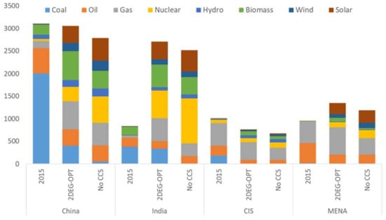 Section 4.3 presents the impacts of decarbonisation on the energy system of developing regions. Driven by ambitious climate policies and high carbon pricing, the energy sector of developing regions is set for a large-scale transformation driven by reduced consumption of fossil fuels over 2015–2050, which ranges from 23% in 2DEG-OPT to 50% in NOCCS scenario. The fossil fuel markets benefit from the emergence of CCS technologies, with the gas market of developing economies even increasing from 2015 levels. High carbon pricing mostly penalises the combustion of coal, which has the highest carbon intensity among fossil fuels, with coal consumption declining by 66–95% over 2015–2050. Natural gas would remain a relevant fuel, especially in major hydrocarbon producers (such as Commonwealth of Independent States (CIS) and Middle East and Norther Africa (MENA), but also in China and India where gas may substitute coal in power generation and in industrial applications, due to its lower carbon intensity. The model-based findings suggest that wind, solar, bioenergy and nuclear power are increasingly deployed to satisfy the increasing energy requirements of developing countries as their incomes grow, while the expansion of hydro-electricity is constrained by its relatively limited untapped potential in most regions []. Overall, energy system decarbonisation is driven by the rapid uptake of renewable energy, energy savings, electrification of end uses and fuel switch towards low-emission energy carriers, such as biofuels (Figure 7).