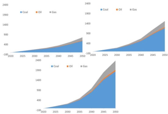 The coal sector is currently under pressure as it faces high competition from gas and renewable energy, with coal consumption declining in all developed economies, but recently also in low-income countries as a result of COVID-19 impacts. Recent developments in the coal market indicate that the number of cancelled plants is increasing, while new coal capacity additions face increasing difficulties worldwide []. Carbon pricing would force reduced operation of existing fossil-fired power plants and pose additional challenges to recover the plants’ variable and fixed operational costs, leading to their premature retirement; these plants are considered to be stranded.