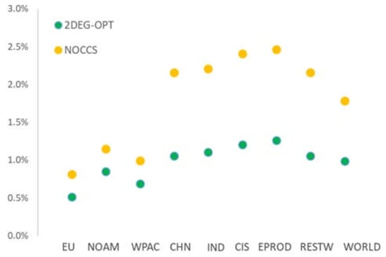 Energy system decarbonisation is a capital-intensive process characterised by the transition towards clean energy technologies and energy efficiency, which require high upfront capital costs, but result in reduced operation and fuel purchase costs in the longer term. The model-based analysis shows that the 2DEG-OPT scenario would result in higher energy system costs relative to Reference, with the increase across regions ranging between [0.5–1.4] percentage points of GDP (Figure 11). Mitigation costs are generally higher in developing regions, as the imposition of globally-harmonised carbon prices would result in larger relative emission reduction effort in countries with higher carbon intensities, such as China and India, while costs are even higher in the CIS and MENA regions that additionally suffer from reduced fossil fuel export revenues []. Cost increases are much lower in developed economies (on average less than 0.7% of their GDP) as they have low carbon intensities and may benefit from reduced fossil fuel imports. Cost increases are driven by the deployment of costly clean energy technologies and infrastructure to support the transition (e.g., battery recharging, grid investment, storage) and high investment in building retrofits. Lacking some of the emission reduction technologies results in increased abatement costs, as the remaining mitigation options have to be used at levels higher than in 2DEG-OPT with higher marginal costs and closer to their maximum potential. Thus, the absence of CCS would lead to increased deployment of other decarbonisation technologies (e.g., renewable energy, nuclear) at levels higher than their economically optimum level and cause additional cumulative costs of [0.3–1.3] percentage points of GDP across regions compared to 2DEG-OPT over 2025–2050 (Figure 11). Much of the increased costs are directed to storage capacity and grid expansion to support the increased generation from variable RES, combined with costly investment in energy efficiency and nuclear power. The learning potential of low-carbon technologies (triggered by increased learning-by-doing) partly offsets, but cannot cancel out, the increased energy system costs. This also drives increased electricity prices relative to 2DEG-OPT, which make more costly the abatement effort in sectors that rely on electrification, such as transport and buildings.
