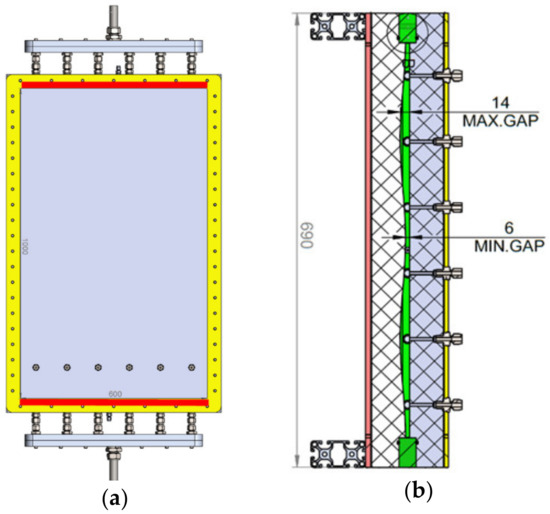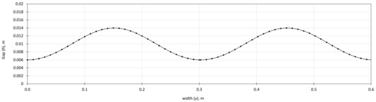 where E(x) is the elliptic integral of the second kind [30]. The width of the Hele–Shaw cell is calculated as 2πr*, which is 0.3 m here. The calculated variation of the gap by the width of the cell can be seen in Figure 1 for a 0.6-m width that is double the calculated width for removing the boundary effects. As shown in this figure, the minimum and maximum gaps are 6 mm and 14 mm, respectively, and the cross-sectional area of the cell is 0.006 m2. The 0.3-m width in the middle section of the model is the main section of analysis without any probable boundary effects. The length of the model is 1 m, and the real pump rate in the lab will be 6 × 10−4 m3/s, which is twice the calculated pump rate in Table 1 (3 × 10−4 m3/s) for achieving a mean flow velocity of 0.1 m/s.