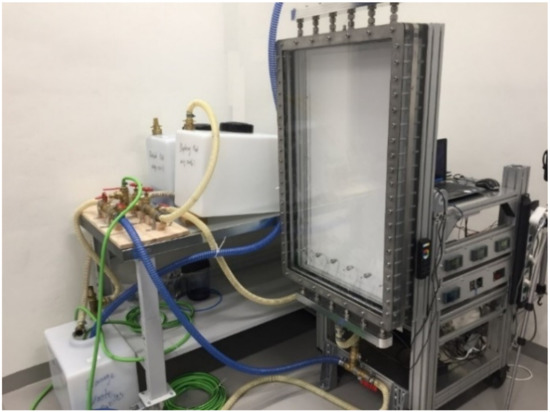 The experimental setup consists of two centrifugal pumps for pumping displacing and displaced fluids into the cell, a variable frequency drive to adjust the displacing fluid flow rate, a Heinrichs magnetic flow meter, two GE Druck pressure transmitters, and a Fuji differential pressure transmitter. The ports of the pressure transmitters were placed in spaces with a depth of 15 mm, length of 600 mm, and width of 15 mm (more than 10 mm average gap in the main body of the cell), as shown by the color red in Figure 2a. The pumped fluids are spread in these spaces before arriving in the cell and leaving it. During the displacement flow tests, the bottom and top transmitters are in contact with the displacing and displaced fluids, respectively. The whole setup is in Figure 3. The Hele–Shaw cell is in a vertical direction for performing the tests, and the flow is in the vertical direction from the bottom to the top. A displaced fluid first fills the cell from the bottom. This fluid is then displaced with a displacing fluid with a higher density and viscosity from the bottom to a specified height below the particle release-ports and with a very small flow rate to have a flat interface between the two fluids. Subsequently, the particles are released into the cell in the displaced fluid using syringes filled with the particles. The particles are released in the displaced fluid with lower density and viscosity to have more opportunity to immerse them on the interface. The interface is then moved slowly to a height of 20 cm from the bottom of the cell. This is the initial status of the interface for the start of the tests. The experiment starts by pumping the displacing fluid from the bottom into the cell. The flow rate, pressures at the inlet, and outlet and pressure differences are logged on a PC, and images of the displacement process are recorded using a Canon EOS 5D Mark IV camera at one-second intervals.
