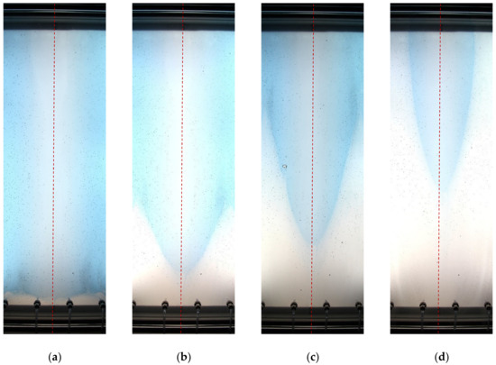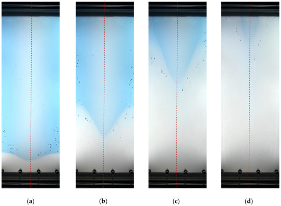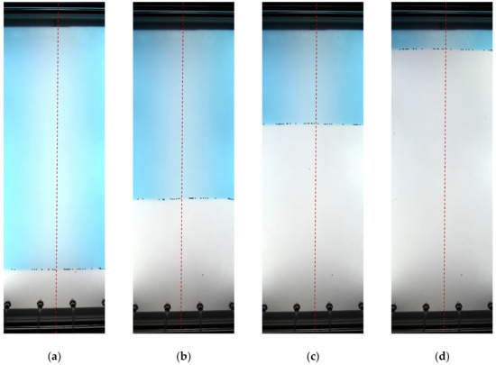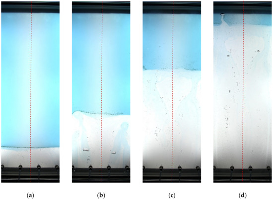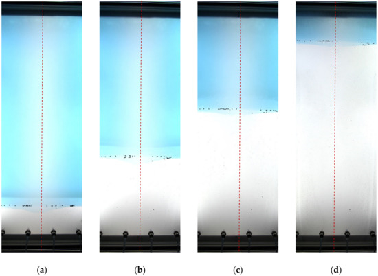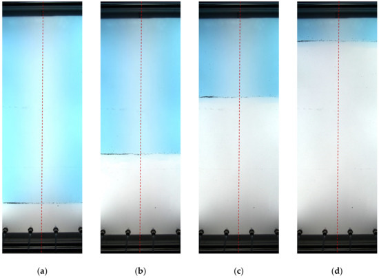 Snapshots of displacement flow in test no. 5: (a) t = 0 s; (b) t = 4 s; (c) t = 8 s; (d) t = 12 s.
