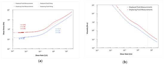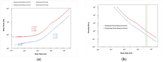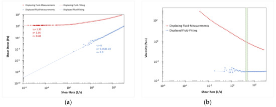 Rheological behavior of the displaced and displacing fluids in test no. 9. (a) Flow curve; (b) equivalent viscosity.