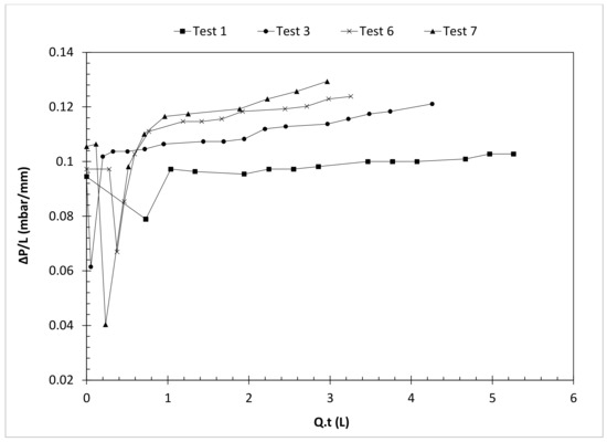 The pressure gradients recorded by the two pressure transmitters for some of these tests in the eccentric Hele–Shaw cell were plotted in Figure 16. ΔP is the measured pressure drop involving hydrostatic and frictional pressure drops in the cell, and L is the height of the cell in these plots. The x-axis is the volume of the pumped displacing fluid from the time of zero. Over time, increasing trends are observed in the measured pressure gradients in all four tests in this graph for the displacement flow periods. Test no. 1, with two Newtonian fluids, has the lowest pressure gradient with negligible frictional pressure drop, and test no. 7, with two non-Newtonian fluids with yield-stress, has the highest pressure gradient, with a hydrostatic pressure drop similar to tests no. 1 and a considerable frictional pressure drop. Test no. 3 with a Newtonian displaced fluid, and a non-Newtonian displacing fluid is in the middle. Test no. 6 has lower pressure gradients than test no. 7 due to lower flow rate and lower frictional pressure loss. At the start of the tests, the measured pressure gradients have strange behavior because of the initial disturbances and unstable conditions due to the pumping of the fluids.
