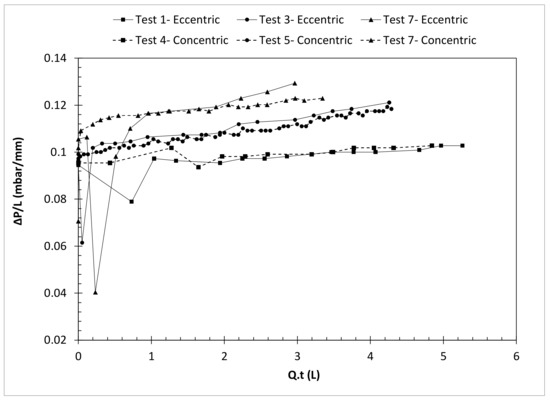 Comparison of pressure gradients of displacement flow tests in the cells with eccentric and concentric geometries [31] and with the same cross-sectional area is shown in Figure 17. Comparing the tests with the same used fluid in the concentric and eccentric geometries shows that the effect of eccentricity on the pressure gradients is not significant in these displacement flows, where the hydrostatic pressure gradient has a dominant role. In this figure, the same trends exist for displacement flow tests in these two geometries. Test no. 1 in eccentric geometry has almost the same behavior as test no. 4 in concentric geometry with the same used fluids and properties and close displacing flow rates (18.06 and 16.43 L/min in eccentric and concentric geometries). The pressure gradient in test no. 3 in eccentric geometry is comparable with test no. 5 in concentric geometry with the same used fluids (same densities and rheologies, but different effective viscosities due to different shear rates). The displacement flow rates in these two tests are far from each other; 15.27 L/min in the eccentric test and 3.71 L/min in the concentric one. The higher flow rate in eccentric geometry results in the lower effective viscosity of the displacing fluid, but their global effect on the pressure gradient is a negligible increase in pressure gradients in the eccentric geometry with the higher flow rate. By comparing test no. 7 in the eccentric geometry with test no. 7 in concentric geometries with the same used fluids, densities, and rheologies, it can be seen that the higher flow rate of 21.6 L/min in the eccentric geometry than 7.86 L/min in the concentric geometry causes lower effective viscosity, and the recorded pressure gradients in the eccentric geometry are higher than the concentric geometry. While it is known that frictional pressure drop in an eccentric annulus is lower than in a corresponding concentric annulus [24], due to the dominating hydrostatic pressure gradient and somewhat different fluid and flow properties from test to test, this is not apparent from our experiments here. The observed differences of pressure gradients in the eccentric and concentric Hele–Shaw cells are due to the flow rate differences and consequently equivalent viscosity differences rather than the degree of eccentricity.