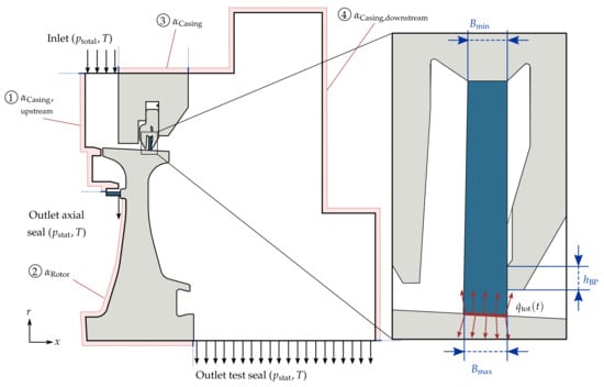 At the inlet, the total pressure and temperature are set according to the respective measured values from the experiments. At the outlets, the static pressures and temperatures are specified. At the outer surfaces ①–④ appropriate heat transfer boundary conditions are defined. Along the outer contour of the rotor, a circumferential speed corresponding to the tests is set. In the detailed section in Figure 1, it can be seen that the specific total frictional power loss is applied to the contact area between the seal and rotor: