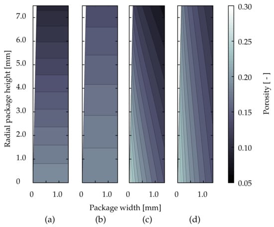 Distribution of porosity in the bristle package with consideration of: (a): width, (b): radius, (c): width + ax. compression, and (d): width + radius + ax. compression