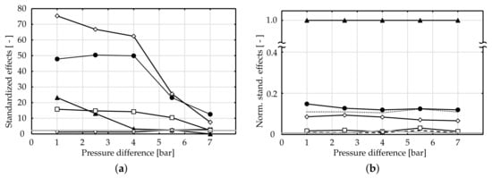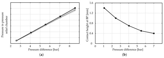 When adjusting the pressures in the pressure relief chamber, the contact height of the package at the back plate plays a decisive role in addition to the porosity of the package or the package width. The contact height has a significant influence on the radial pressure drop and, thus, the chamber pressures. In Figure 5a, the calculated and measured chamber pressures are plotted over the absolute pressure upstream of the seal. After adjusting the contact heights according to Figure 5b, the chamber pressures are within the measuring range. This is spanned by the deviations of the measured values at the circumferential positions of 0 and 180°. The decrease in the contact height with an increase in the differential pressure could, be explained by an increase in the axial deflection of the bristles and, therefore, also appears to be physically plausible, as described in Section 3.