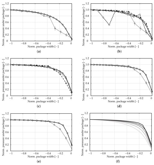 Norm. pressure under the package plotted against the norm. package width, (a): CFD (