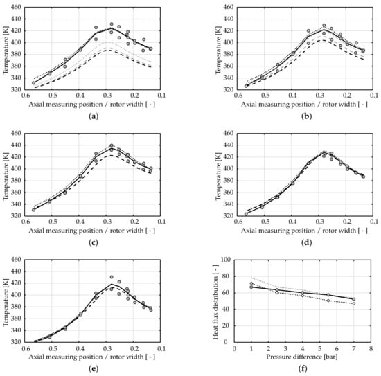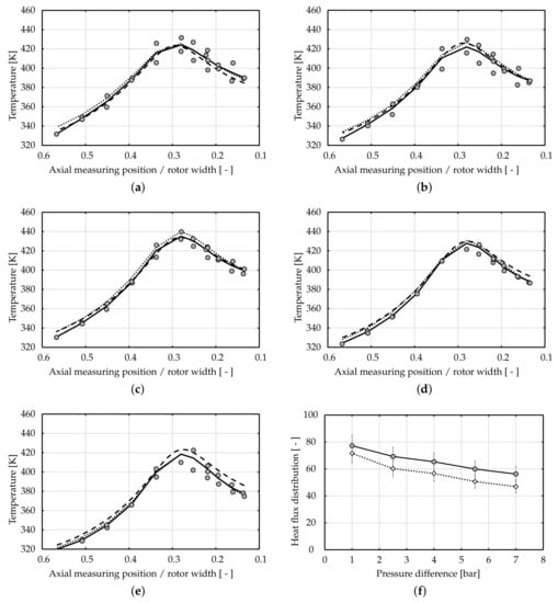 In general, the measured values of Schur et al. [31] are well matched. The pressure gradient increases in the area of the back plate, whereby this effect increases with increasing pressure difference. In Figure 6f, this can be clearly seen when looking at the numerically calculated pressure profiles. The differences between the measured values and the calculations can be explained by different operating conditions. In the experiments conducted by Schur et al. [31], a circumferential speed of 47 m/s was present, while the measurements by Bayley and Long [41] were carried out purely statically. In the simulation, a circumferential speed almost twice as high as the value referred to by Schur et al. [31] is set. However, Schur et al. [31] could show that, with increasing speed, the pressure level also continues to rise. Furthermore, the measured values of the investigations by Schur et al. [31] are only available up to a pressure difference of 5.0 bar.