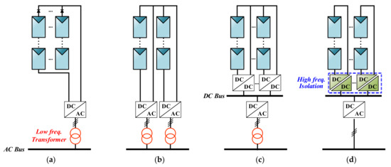Grid-tie photovoltaic (PV) systems. (a) Centralized structure. (b) String structure. (c) Multi-string structure with non-isolated DC–DC converters. (d) Multi-string structure with isolated DC–DC converters.