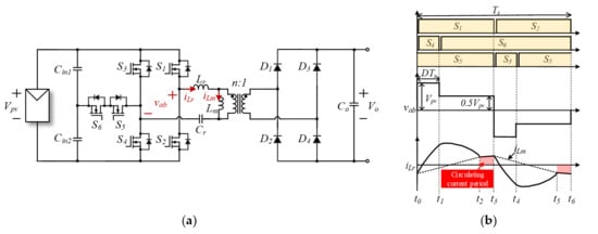 As a result, the isolated DC–DC converter has been considered to eliminate the low-frequency transformer [19,20,21,22,23,24]. In particular, the conventional full-bridge LLC resonant converter has an inherent entire-range zero-voltage switching (ZVS) characteristic with a low turn-off current of the primary switches [25,26,27,28,29]. For this reason, the resonant DC–DC converter with high-frequency isolation is widely used in various applications. However, the converter operates within a wide switching frequency range (above and below regions) under a wide PV voltage range, and low magnetizing inductance is required. The low magnetizing inductance increases the circulating current and conduction losses, especially at frequencies greater than the resonant frequency (fr). The dual-bridge LLC (DBLLC) resonant converter presented in [30] is shown in Figure 2a. The topology operates with a fixed switching frequency (fs) and the PV voltage Vpv is regulated by the mode change between the full-bridge (FB) and the half-bridge (HB) components within a half switching cycle, as shown in Figure 2b. The primary-side switches achieve ZVS turn-on while the secondary diodes are turned off with the zero-current switching (ZCS). The resonant tank of the aforementioned converter is simple given that the voltage gain is independent of the quality factor, and the magnetizing inductance has little influence on the voltage gain. Moreover, the topology utilizes high magnetizing inductance, leading to high efficiency.
