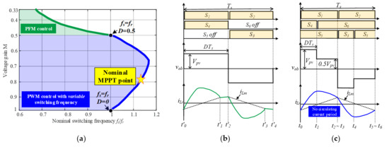 In this mode, the load power is not supplied from Vpv to Vo, and the circulating current is conducted on the primary side. This circulating current period increases the peak and RMS values of the resonant current, resulting in high switching loss and conduction loss. In the proposed PWM control scheme with a variable frequency, this period can be eliminated by operating in the above region.
