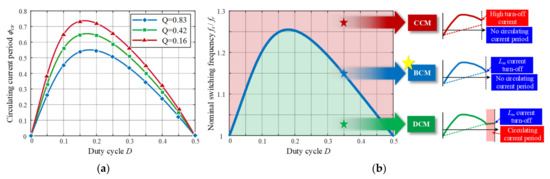 Figure 5a shows the circulating current period in the conventional PWM control scheme with a fixed switching frequency according to duty cycle period D. The resonant current iLr becomes equal to iLm at the instant t2. The circulating current period is calculated by numerically solving Equations (1)–(4) and (6). The circulating current period is varied according to the Q factor, which is defined as n2wrLr/RL and which can be shorter with a high value of Q. Figure 5b shows the switching frequency boundary for the BCM mode when Q is 0.83. The switching frequency boundary for the BCM mode is determined when the t3 − t2 is zero. The switching frequency for the BCM mode is expressed as shown below: