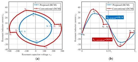 Figure 6 shows the results of a steady-state trajectory comparison between the proposed PWM control method with a variable switching frequency and the conventional PWM control with a fixed switching frequency using Equations (1)–(9). It should be noted that the proposed control scheme leads to lower magnitudes of the resonant current and resonant voltage compared to the conventional control method. Figure 6b is the resonant current comparison at time domain, which shows that the rms value of the resonant current in the proposed PWM control is smaller than that of the conventional PWM control by 15%.