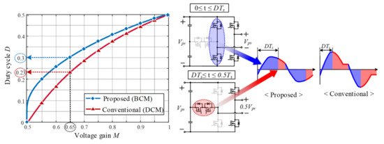 Figure 7 shows a comparison of the voltage gains between the proposed PWM control and the conventional PWM control schemes. The proposed scheme requires a higher duty cycle in the entire voltage gain range than the conventional scheme. At a voltage gain of 0.65, the duty cycle of the proposed scheme is 0.23, while that of the conventional scheme is 0.3. Therefore, the period of circulating current of the proposed scheme is 0.2, which is smaller than that of the conventional scheme of 0.27. As a result, the proposed scheme eliminates the circulating current and minimizes the turn-off losses of the switches, thereby achieving high efficiency. The voltage gain of the proposed PWM control scheme is expressed using the first harmonic approximation (FHA) method as: