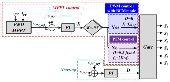 Some MPPT algorithms for tracking the PV string voltage more effectively are suggested in [40,41], and the well-known perturb and observe (P&O) algorithm is applied in this paper to validate only the converter performance. When the inverter regulates the DC-link voltage, the proposed DBLLC resonant converter controls the PV string voltage by means of the perturb and observe (P&O) MPPT control, as shown in Figure 9. In this paper [42], the PV module data are listed in Table A1 of the Appendix A. The PV voltage is given as from 300 V to 900 V, and the output voltage of the converter is fixed at 900 V, as shown in Table 1. In order to operate the wide PV voltage range, the transformer turn ratio is designed to be 0.5. Thus, when the PV voltage is larger than 450 V, the converter performs PWM control to regulate the output voltage to 900 V. However, when the PV voltage is less than 450 V, it operates in PFM control to boost the output voltage to 900 V due to low PV voltage. Accordingly, when K is lower than 0.5, the duty cycle of S3 and S4 is the control variable and the switching frequency is varied according to fs_BCM, which is calculated using Equation (10). Therefore, the DBLLC converter operates in the BCM that eliminates the circulating current period, thereby achieving high efficiency. Meanwhile, when K is higher than 0.5, the switching frequency is the control variable to operate in PFM control and the duty cycle of S3 and S4 is fixed at 0.5. Since the voltage gain is linear between the PWM control scheme and the PFM control scheme, there is no transient state during a mode change. When the inverter is in a pause state, one of the DBLLC resonant converters controls the DC-link voltage via PS control. The duty cycle D is increased slowly from 0 to charge the DC-link capacitor.