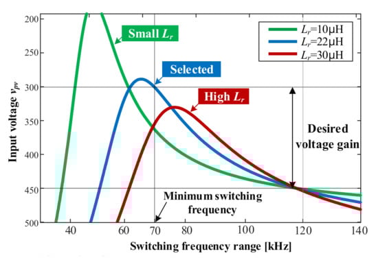 where quality factor , reflected load resistance , inductance ratio Ln = Lm/Lr, and nominalized switching frequency fn = fs/fr. With a small Lr value (green line), a wide switching frequency range is required to satisfy the requirements of the desired voltage gain due to the flat gain curve. Because the minimum switching frequency is limited to 70 kHz, considering the volume of the transformer, a small magnetizing inductance value design is required to increase the voltage gain, which increases the conduction loss and the switching loss. The maximum switching frequency for the BCM mode is increased due to the low Q factor. Although the voltage gain curve is sharp with a high Lr value (red line), the desired voltage gain in this case as well cannot be acquired due to the reduced peak voltage gain. Therefore, a design with a small magnetizing inductance value is required to increase the voltage gain. A resonant inductance value of 22 μH is selected considering the maximum switching frequency for the BCM mode and the magnetizing inductance value.