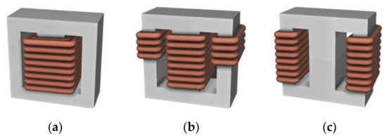 Generally, both primary and secondary windings are wound on the center leg, as shown in Figure 11a [43,44]. The Lm value can easily be adjusted by changing the air gap distance of the core; however, there is limitation to the Lk value because it can only be adjusted by changing the distance between the primary and secondary wires. This winding method has the lowest Lk value because the distance between the primary and secondary windings is narrow [45]. Therefore, for this winding method, an additional resonant inductor should be used when a sufficiently large Lk value is required to operate over a wide voltage range. An example of this would be an LLC resonant converter. Meanwhile, by placing some of the secondary turns on the outer legs of the core, as shown in Figure 11b, the leakage inductance can be increased since there is more leakage magnetic flux flowing into the air. The leakage inductance can be increased further by distributing more windings on the outer legs. The largest Lk value can be obtained by winding all of the secondary side turns on the outer leg, as shown in Figure 11c, in which case the internal Lk of the transformer can be used as the resonant inductor without using an additional inductor [46].