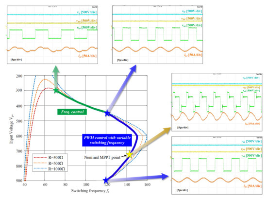 Figure 14 shows the experimental waveforms of the proposed hybrid control in a wide PV voltage while the output voltage is constant at 900 V. When the PV voltage is 300 V, the DBLLC resonant converter operates in the FB mode, and the switching frequency of 84 kHz is lower than the resonant frequency. The amplitude of the resonant tank voltage vab is equal to the PV voltage, and the PV voltage is regulated using the PFM control scheme. When the PV voltage is 450 V, the DBLLC resonant converter operates in the FB mode, and the switching frequency is near to the resonant frequency of 120 kHz. The amplitude of the resonant tank voltage vab is still equal to the PV voltage. When the PV voltage is equal to 720 V, the DBLLC resonant converter operates with the proposed PWM control scheme, and the switching frequency is varied in the above region in order to eliminate the circulating current period. The FB mode and the HB mode are varied to regulate the PV voltage. When Vpv is 900 V, the DBLLC resonant converter operates in the HB mode and the switching frequency is near to the resonant frequency of 120 kHz. The amplitude of the resonant tank voltage vab is equal to half of the PV voltage. As a result, the peak and RMS values of the resonant tank current iLr are able to be minimized by the proposed PWM control scheme with a variable switching frequency. Furthermore, a wide PV voltage range (300 V–900 V) is regulated by the PFM control scheme.