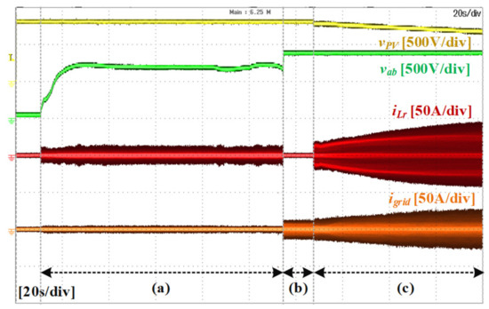 Figure 16 shows the experimental waveforms of the proposed soft-start up and initial operation sequence. This method is used to smoothly charge the bulky electrolytic capacitors of the DC-link to decrease inrush current. Therefore, the resistive pre-charge circuits of the inverter were eliminated. In period (a), the DBLLC resonant converter regulates the DC-link voltage gradually from 0 V to supply the system power such as in the inverter condition using the PS control scheme. Then, the inverter regulates the DC-link voltage during period (b), while the DBLLC resonant converter is paused. In period (c), the DBLLC resonant converter regulates the PV voltage with the proposed hybrid control scheme to track the MPPT point.