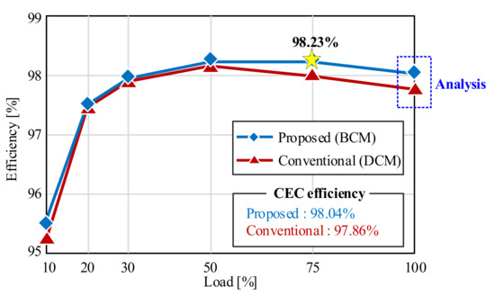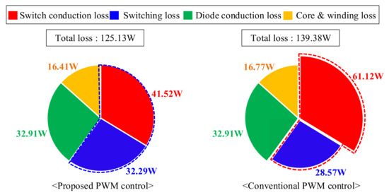 Figure 17 shows a comparison of the measured efficiency rates between the proposed PWM control and the conventional PWM control schemes when VPV = 720 V and Vo = 900 V. The maximum and California energy commission (CEC) efficiency of the proposed PWM control are 98.23% and 98.04%, respectively, values greater than those by the conventional PWM control by 0.1% and 0.2%, respectively. This is because the switches losses are reduced by eliminating the circulating current period by the proposed PWM control. Figure 18 shows the results of a loss analysis when Po = 6.25 kW with PWM control. Despite the fact that the switching loss is higher due to the increased switching frequency, the conduction losses of the primary switches of the proposed PWM control scheme are smaller due to the elimination of the circulating current period and the reduced turn-on period of the bidirectional switch.