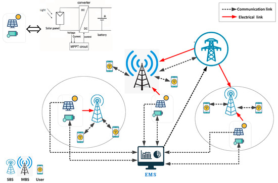 Figure 1 illustrates the energy flow within different elements of a solar-powered next generation telecommunication network that consists of a macro base station (MBS) and two small base stations (SBS). The red arrows represent the energy flows, whereas the black-dashed arrows represent the communication links. Each base station is equipped with a PV-battery system. The energy management system (EMS) unit as a central controller collects information regarding power consumption, generation, and ES state, and sends commands to the dispatchable units [3]. The determination of the power rating of the PV system and battery capacity in PV-battery equipped base stations can be tackled by establishing an optimization framework which considers the amount of available power produced by installed PV panels and the profile of power consumed by the base stations (BSs).