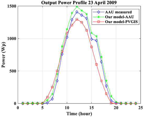 In order to validate the built model, the estimated output power based on the presented model using the irradiation and temperature data from the Aalborg University (AAU) site as well as the PVGIS [32] are compared with the measured output power of the installed PV system in the AAU for 23 April 2009 and the results are shown in Figure 2.
