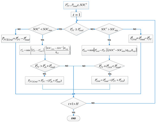 The flowchart of the selected power dispatch strategy is illustrated in Figure 3. When the PV generation is more than the load demand, after supplying the load, the extra energy will be stored in the battery if it is not fully charged. Any surplus energy will be delivered to the electric grid. If the PV cannot provide enough energy to supply the load, the first choice is to discharge the battery. If there is not enough energy stored in the battery, then the electricity will be purchased from the main grid such that the power balance be satisfied.