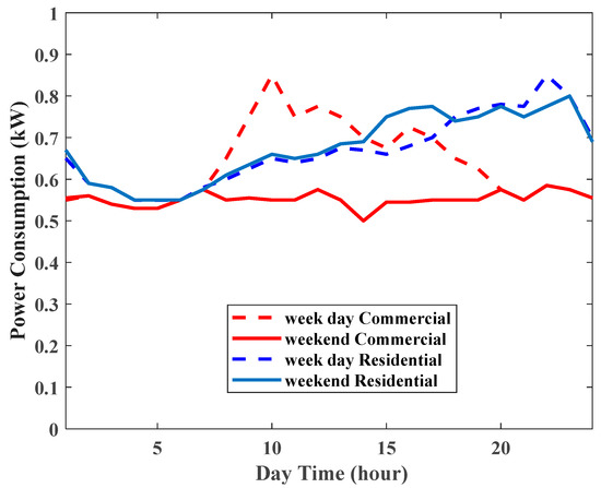 Weekday and weekend power consumption for a macro base station in commercial and residential areas.