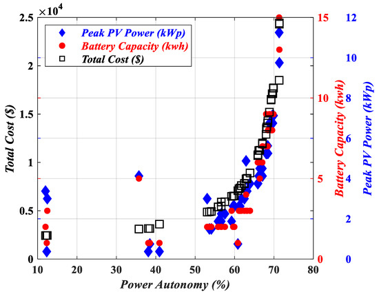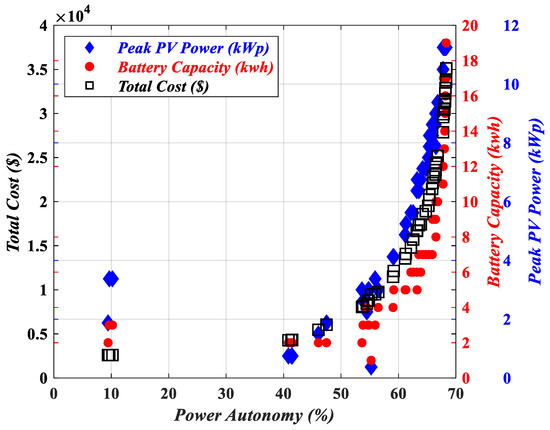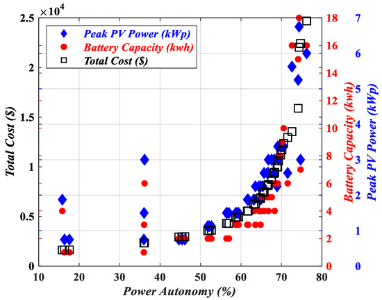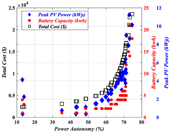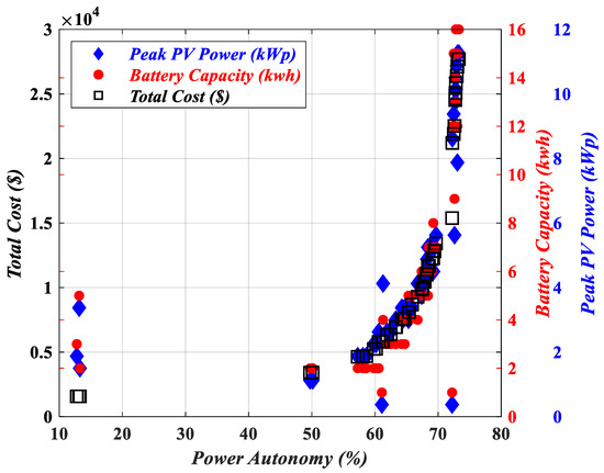 Pareto-optimal solutions of different power autonomy levels at different values of total cost in a residential area.