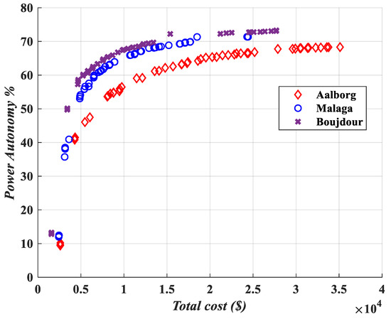 Figure 9 demonstrates the Pareto-optimal solutions of different power autonomy levels at different values of total cost for a PV-battery system-powered base station in a residential area in Aalborg, Malaga and Boujdour. According to Figure 9, in the case of Aalborg, it is difficult to achieve a power autonomy factor of 70% due to the low solar irradiation. However, in order to achieve a maximum power autonomy factor of 68% in Aalborg, the total cost equals $35,000. For Malaga, the maximum achievable power autonomy factor is 71% for a total cost of $24,000. For Boujdour, the maximum achievable power autonomy factor is 73% for a total cost of $27,700.