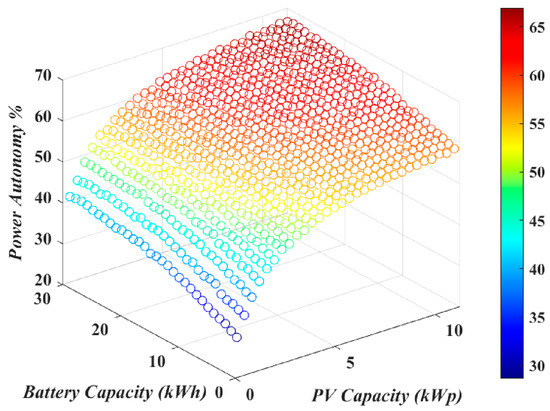 Figure 10, Figure 11 and Figure 12 respectively show the values of total cost and power autonomy factor for a variety of peak PV power and battery capacity values for Malaga, Aalborg and Boujdour in residential area case studies. Accordingly, as an example, in the case of Malaga, to achieve a power autonomy factor of 68%, installation of a 5.3 kWp PV panel and a 9 kWh battery is required, which leads to a total cost of $12,900. For the case study of Aalborg, in order to have a power autonomy factor of 68%, installation of a 11.25 kWp PV panel and a 19 kWh battery is required, which leads to a total cost of $35,000. In Boujdour, a 4.5 kWp PV panel and a 5 kWh battery need to be installed, which leads to a total cost of $10,400.