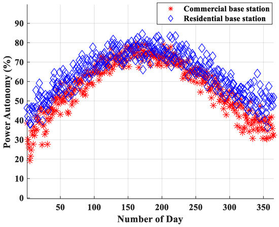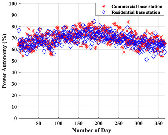 According to Figure 5 and Figure 9, solving the PV-battery dimensioning problem for supplying base stations in cellular networks leads to a set of solutions with different values of economic index (total cost) and self-sufficiency (power autonomy). Consequently, based on the priority of each of the mentioned indices, an MNO can adopt one of the solutions. If the economic aspect is of high importance, the adopted solution leads to a low power autonomy level; on the other hand, if the self-sufficiency aspect is more important, supplying the base station using a PV-battery system leads to a high economic cost. The MNO should always adopt a trade-off between these two approaches.