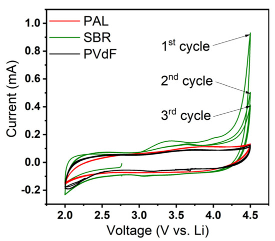 First, the electrochemical stability of the binder was investigated through the CV of HS-3E flat cells, and the result is shown in Figure 1. During the 3 cycles within 2.0~4.5 V, the oxidation peaks appear at voltages approximately above 4.2 V only in the SBR electrode, although the peak intensity decreases as the cycle proceeds. However, there is no corresponding reduction peak in the cathodic scan to 2.0 V, indicating that the oxidation of SBR is irreversible. These findings are consistent with those of the previous study. Yabuuchi et al. [41] reported that the unsaturated C=C of butadiene chains in SBR was oxidized at voltages above 4.2 V. By contrast, no distinguishable oxidation peaks exist in the CV curves of the PAL and PVdF electrodes, other than typical electrochemical double layer characteristics [44]. Therefore, there is no doubt that PAL is as electrochemically stable as PVdF within the cathodic working voltage. The slight current increases in the PAL and PVdF electrodes during the anodic scan near 4.5 V are attributable to the electrochemical decomposition of electrolytes. From this simple CV result, the new water-based PAL can be applied as a cathodic binder, at least over LFP electrodes, unlike the SBR binder.