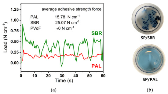 (a) 180° peel strength of LiFePO4 (LFP) electrodes containing PAL, SBR, or PVdF binder. (b) Dispersion of SP in PAL and SBR latices.