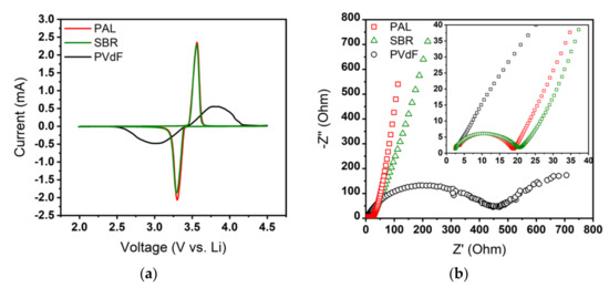 (a) CV and (b) impedance spectroscopy (EIS) of the LFP electrodes containing different binders.