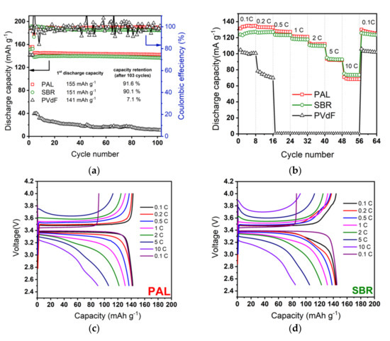 Finally, Figure 5 shows the electrochemical performance of the LFP electrodes with respect to the long-term cycle and rate-capability. The electrodes containing a PAL or SBR binder show excellent long-term cycling stability with the discharge capacities of 142 mAh g−1 for LFP/PAL and 136 mAh g−1 for LFP/SBR after 100 cycles. By contrast, the LFP/PVdF electrode suffers from severe capacity fading, such that the capacity retention is only 7.1% at the 100th cycle. In addition, the PVdF electrode shows serious unstable coulombic efficiency, whereas the others have superior stable coulombic efficiencies, above 96%. This is consistent with the results of high-rate tests showing that the cells are charged and discharged at various current densities: 0.1 C, 0.2 C, 0.5 C, 1.0 C, 2.0 C, 5.0 C, and 10.0 C. At each current, eight cycles are repeated, and then the current returns to 0.1 C to check the electrode recovery. As shown in Figure 5b, the PVdF electrode shows low capacities even at low currents of 0.1 C and 0.2 C, as well as nearly zero capacity above 0.5 C. This might be caused by the network bonding mechanism of the PVdF binder, i.e., the weak adhesion strength, high electrical resistances, and significant charge transfer resistance caused by the PVdF binder. By contrast, the PAL and SBR electrodes show a good rate performance with a capacity retention relatively higher than 50%, even at 10 C. In addition, the electrodes fully restore their capacities when 0.1 C is given to the electrodes from 10 C, implying that they do not suffer any physical damage with such high current charge/discharge cycles. Further, it is clear from Figure 5c,d, showing the charge-discharge profiles at different current densities, that the LFP/PAL electrode has more stable voltage profiles than the LFP/SBR electrode.