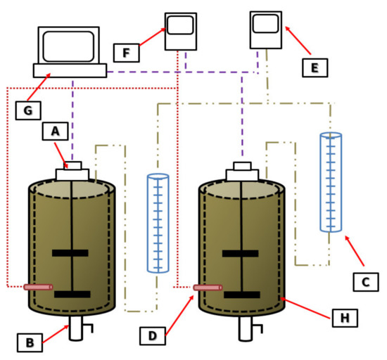 Laboratory AD reactors: A—mechanical stirrer, B—sampling point, C—tubes for measuring the volume of produced biogas, D—temperature probe, E—biogas composition meter, F—temperature meter, G—control system, H—water jacket.