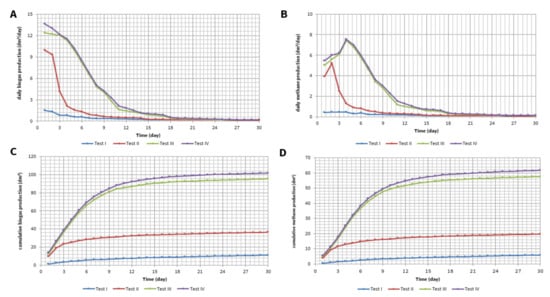 Daily production of: (A) biogas; (B) methane and accumulation curves of: (C) biogas; (D) methane production.