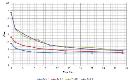 The optimal pH range for the fermentation process should be within 5 to 8. A pH below 5 may interfere with the activity of methane-forming bacteria and stop methane production [35]. The pH was within the recommended range during all tests (Figure 6C). However, during the first days of the process, pH values were lower (especially for tests III and IV). This could have been caused by the high production of VFAs during this period. A similar phenomenon was observed by Azarmanesh R. et al. [30] in their research.