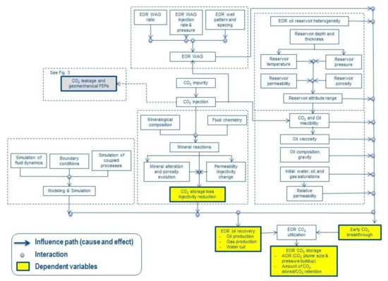 Process influence diagram (PID) for CO2 storage and CO2-EOR risks/FEP in Southwest Regional Partnership (SWP) project. An arrow shows the influence path and each connection point is represented by a filled circle.