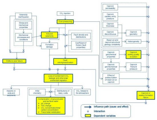 Figure 2 shows the PIDs for CO2 storage and CO2-EOR risks/FEPs. Similarly, the PID associated with the geomechanics and CO2 leakage is illustrated in Figure 3. The risks (dependent variables) that can be quantified in terms of probability density function (PDF) or cumulative distribution function (CDF) are highlighted in the PIDs. In the PIDs, an arrow represents the influence path showing cause and effect. The circle indicates the interaction between FEPs. No loop or chain start with Events in the PIDs. In other words, there should be an appropriate cause for an effect. PID only considers direct impact.