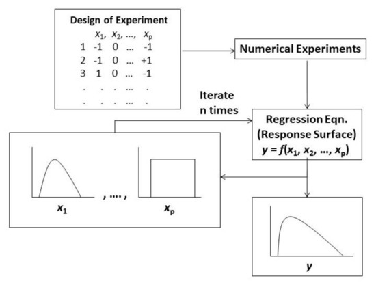Figure 4 summarizes the RSM workflow, which first determines independent variables/factors to construct the design of experiment (DoE), followed by the numerical experiments. Then, the response surface (regression equation or proxy model) is delineated with a stepwise regression technique applied to eliminate insignificant factors from the regression equation. Then, several goodness-of-fit measurements examine the performance of the regression model. Lastly, Monte Carlo samplings of mutually independent input parameters were used in the obtained response surface models in order to generate the CDFs of output responses from the given input distributions without running numerical simulations