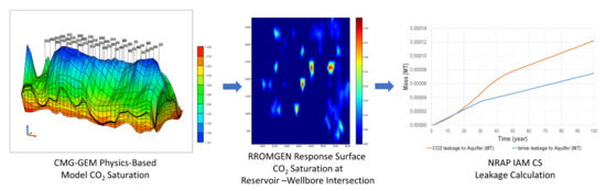 NRAP tool RROM-Gen is used for generating response surfaces for the time evolution of CO2 and water saturation at the depth where wellbores intersect the reservoir. The response surfaces are generated from output data of a reservoir simulator that simulate CO2 injection into the reservoir. Response surfaces of CO2 saturation and pressure are generated as a function of time using RROM-Gen [27]. These response surfaces were then used to estimate the leakage risk from wellbores using NRAP-IAM-CS (formerly CO2-PENS, [28]) from the NRAP tool kit. The workflow is shown in Figure 5 for a generic CO2 sequestration site.