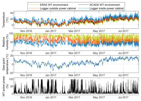 Figure 9 presents the climatic time series measured inside and outside the converter cabinet of WT3 as well as the WT-ambient climatic conditions according to the site-specific ERA5 data. Note that the temperature signal from inside the power cabinet, which is shown in this Figure 9, is the signal measured by the EE16-type combined temperature and humidity sensor.