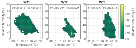 The figure shows at a glance how different the climatic conditions inside the converter cabinets of these WT are: While the maximum temperatures are in a similar order of magnitude, WT1 stands out with a frequent occurrence of temperatures below 20 °C and occasionally even below 0 °C. In all WT, the maximum RH recorded in the cabinet air remains below 80%. WT2 stands out with particularly low levels of RH. In summary, the range of values (i.e., the area spanned by the climatic conditions) is most confined in the liquid-cooled converter inside the nacelle of WT2.
