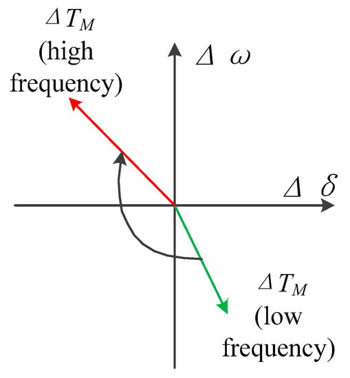 Generally, when Equation (21) is false, ΔTD is in the opposite direction as −Δω in almost all frequency regions. The regulation of a governor provides negative damping and worsens system stability. When Equation (21) is tenable, the direction of damping torque depends on frequency ω. In low-frequency regions, ΔTD is in the same direction as −Δω. The regulation of the governor provides negative damping. In high-frequency regions, ΔTD is in the same direction as −Δω. The regulation of the governor provides positive damping. With the increase in TW, the critical frequency ω1 decreases and system stability improves.