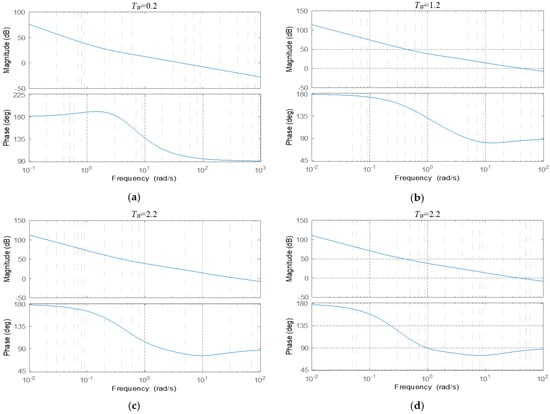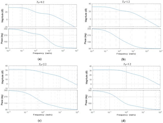 Bode graphs of GYm(s) with different TW: (a) TW = 0.2; (b) TW = 1.2; (c) TW = 2.2; (d) TW = 3.2.